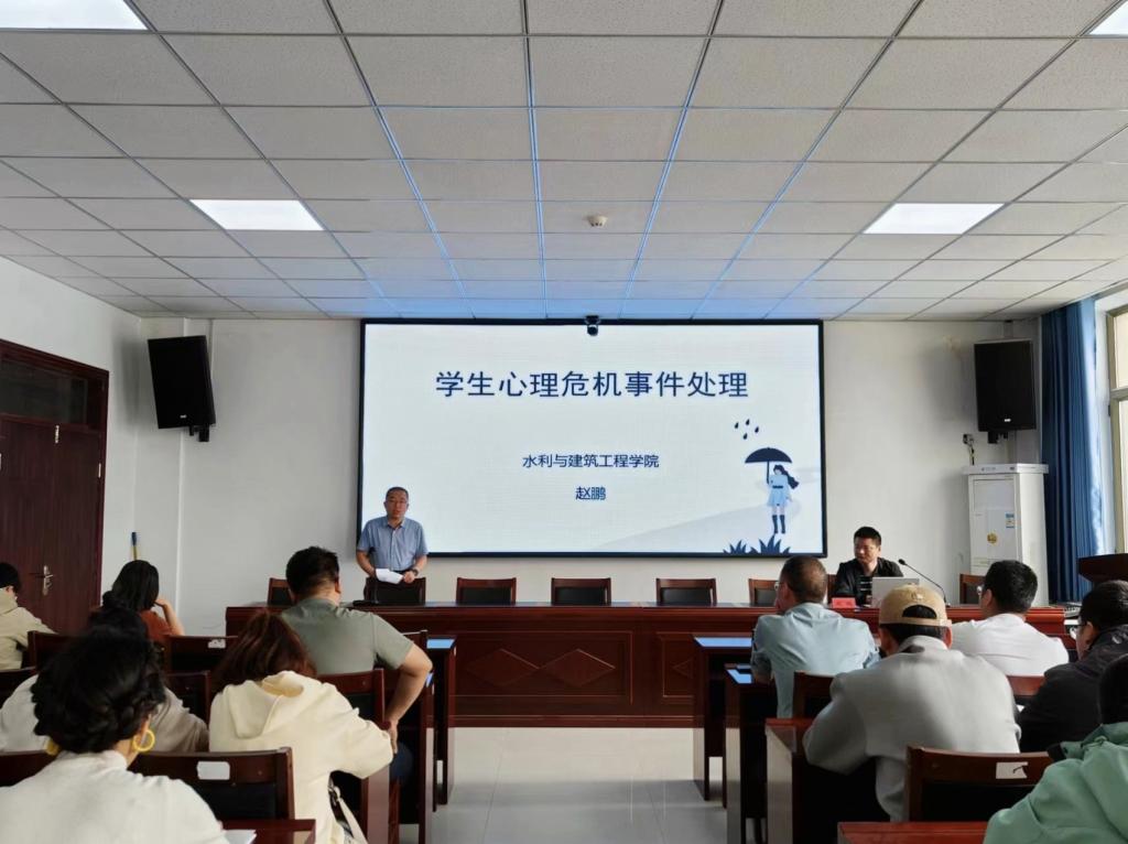 2024年4月17日下午,水利与建筑工程学院开展学生心理危机事件的干预流程培训会,学院党委副书记李新、全体班主任、辅导员参会,培训由学院心理辅导员赵鹏主讲。