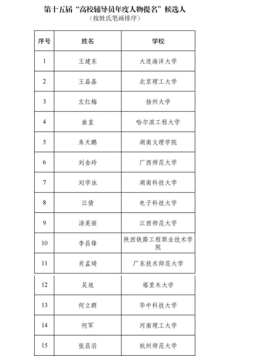 近日,2023年“最美高校辅导员”暨第十五届“高校辅导员年度人物”推选展示活动评选结果公示,根据《教育部办公厅关于开展2023年“最美高校辅导员”暨第十五届“高校辅导员年度人物”推选展示活动的通知》(教思政厅函〔2023〕14号)要求,经组织推荐、资格审查、通讯推选、网络答辩,共遴选出“最美高校辅导员”候选人10名、“高校辅导员年度人物”候选人20名、“高校辅导员年度人物提名”候选人30名。我校人文学院辅导员吴垠位列第十五届“高校辅导员年度人物提名”候选人之一。