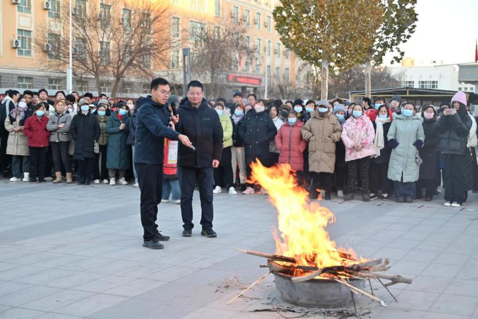 疏散后,保卫部安全生产科庞明辉老师结合高校火灾特点,讲解冬季防火要点、公寓常见隐患及报警逃生技巧,并通过实操演示“提、拔、握、压”灭火器使用方法,组织学生公寓管理人员、老师、同学们分组实践操作。