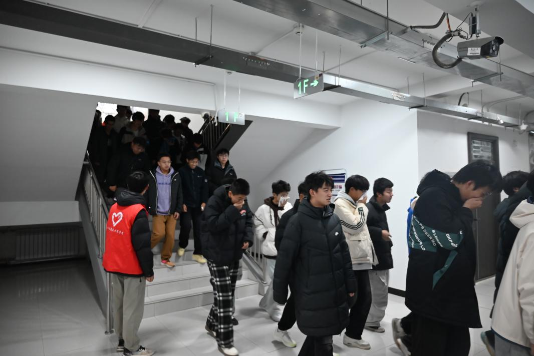 随着警报响起,演练正式启动。在住楼辅导员、公寓管理人员及学生志愿者引导下,同学们捂鼻低姿,沿预定通道快速撤离,仅用不到2分钟便全部集结至西区大舞台。各班级清点人数后汇报,疏散过程紧张有序、无一人遗漏。